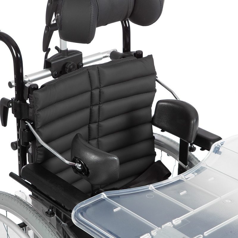 Подголовник и боковые поддержки коляски регулируются по вертикали, горизонтали, углу наклона и обхвату головы, обеспечивая надежную фиксацию и поддержку. Это помогает предотвратить деформации грудной клетки и позвоночника, а также улучшает постуральный баланс. Съемный столик служит дополнительной опорой для верхней части тела, что особенно полезно во время приема пищи.